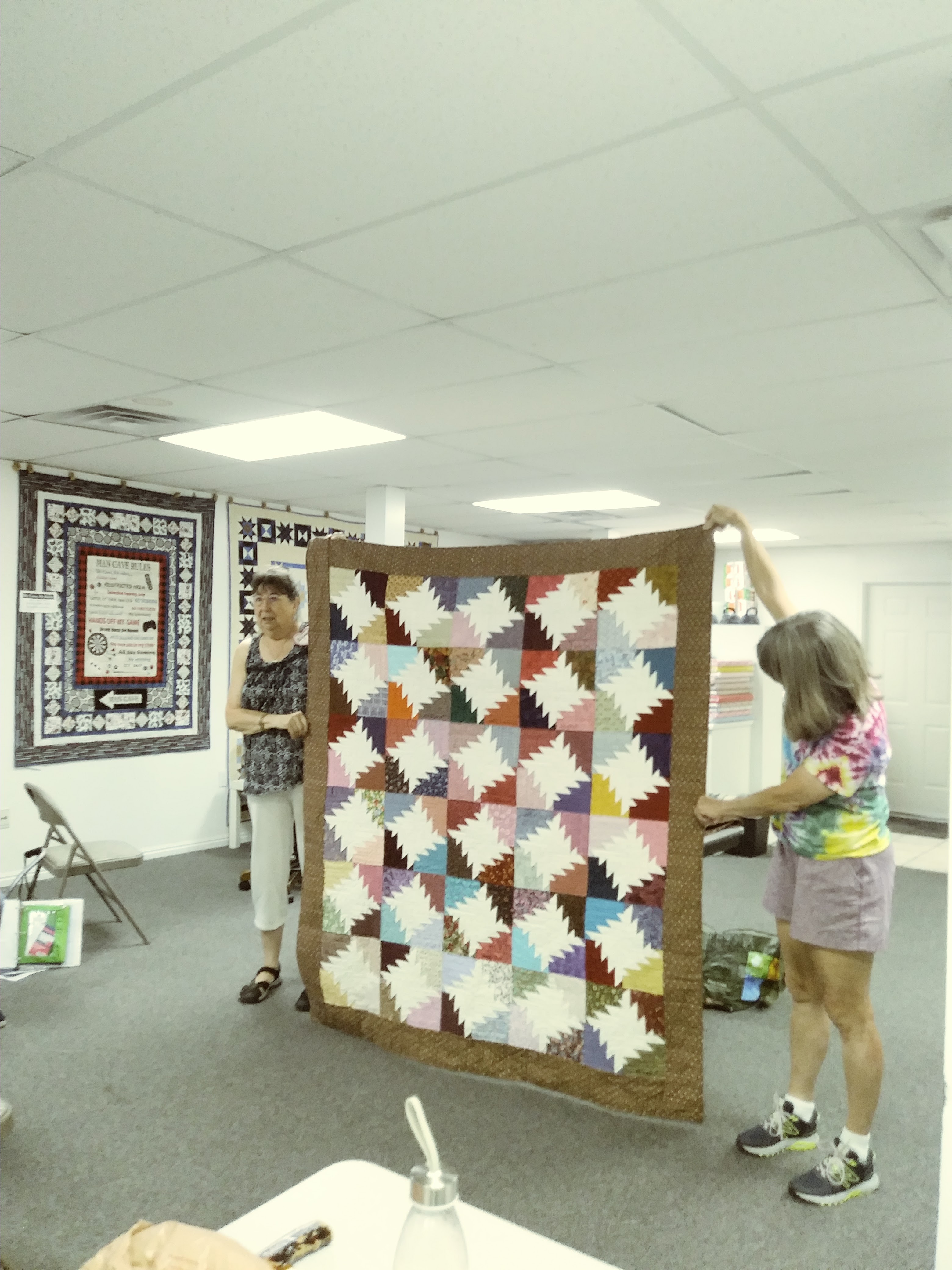 | Tina shows Vanessa's winning entry in the meme contest at Garden of Quilts |